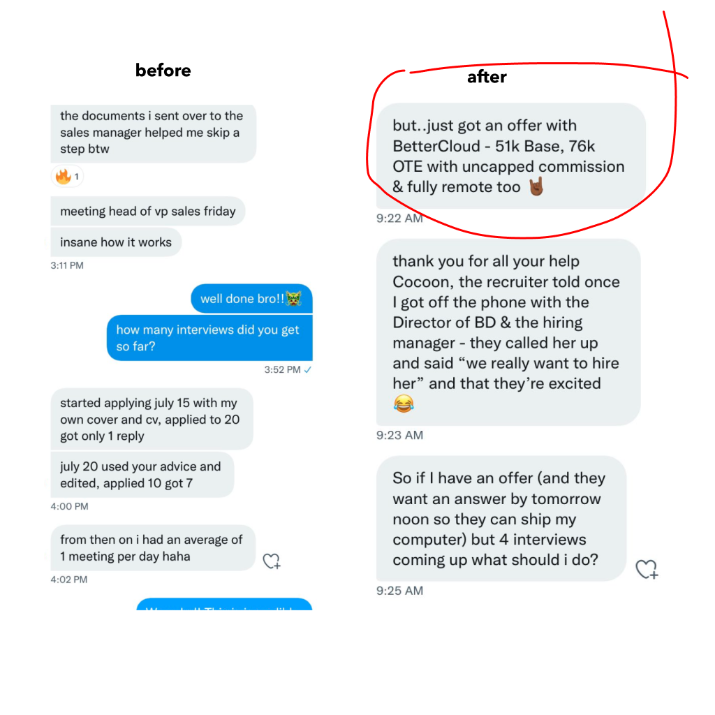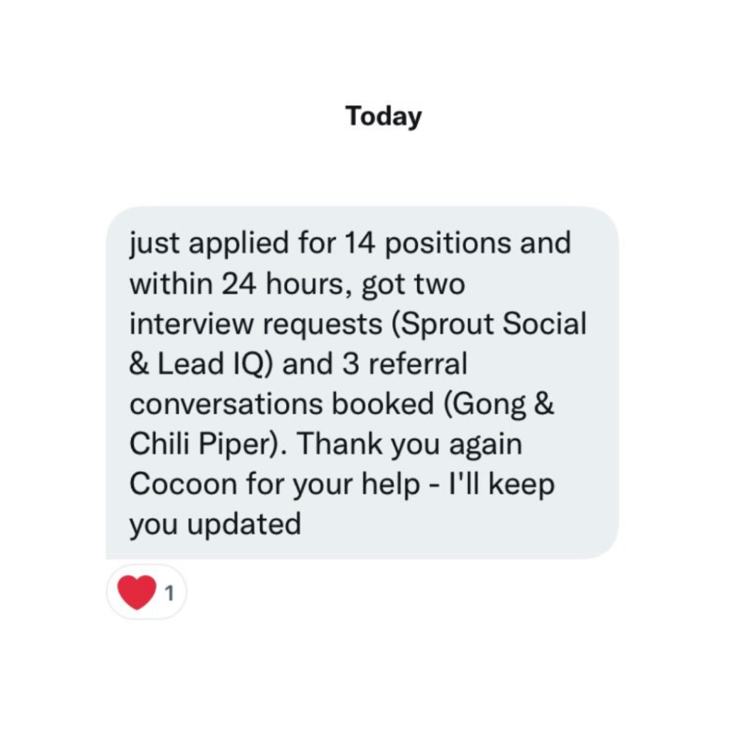 Our 3-Part Cocoon Method has been used by 200+ sales professionals to pursue high-paying roles with greater clarity, confidence, and precision. While we can’t guarantee your outcome, we do offer a conditional money-back guarantee when you complete the full program and action steps.